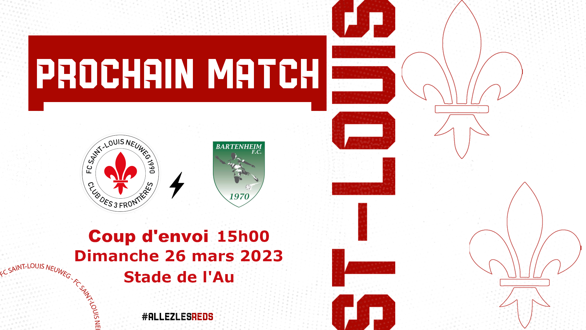 EQUIPE RESERVE   Venez assister au match pour la 14 ème journée de championnat contre BARTENHEIM F.C. ce dimanche 26 mars 2023 – 15H00 au stade de l’Au !   ⚔️ MATCH CHAMPIONNAT 🆚 BARTENHEIM F.C. 🕒Dimanche 26 mars 2023 – 15H00 📍Stade de l’Au   #AllezlesReds⚜