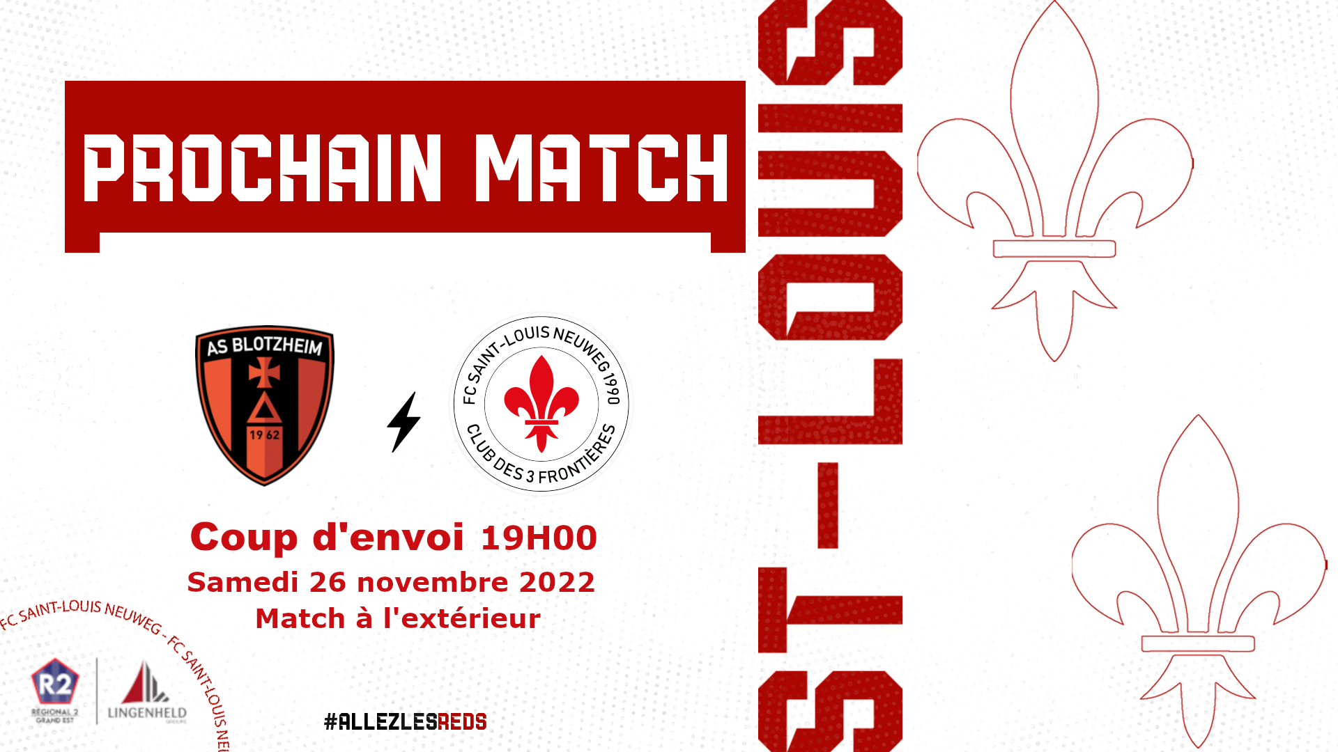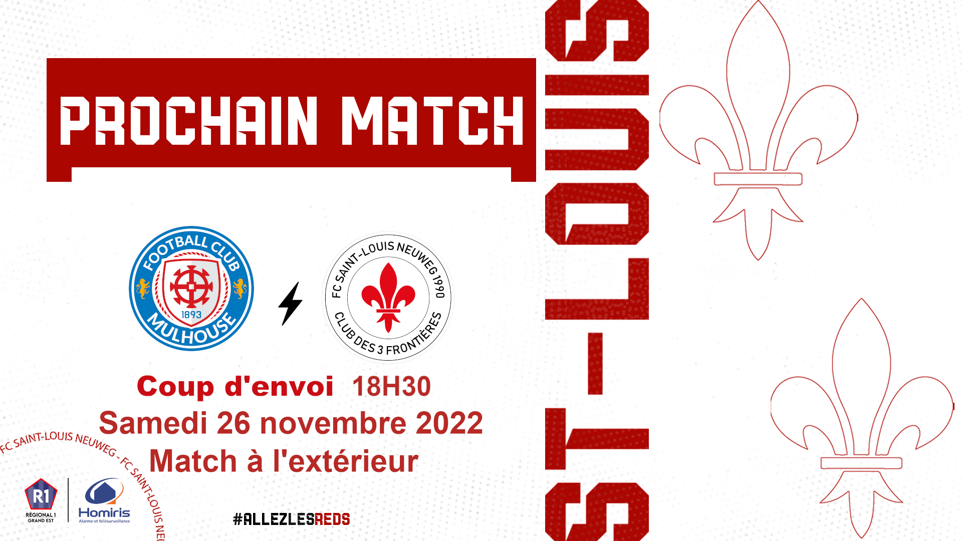 ⚜️EQUIPE FANION⚜️   Les reds se déplacent pour cette 10ème journée pour défier Le F.C Mulhouse dans un derby explosif !   ⚔️ MATCH CHAMPIONNAT 🆚 MULHOUSE F.C. 🕒Samedi 26 novembre 2022 – 18H30 📍Stade extérieur   #AllezlesReds⚜