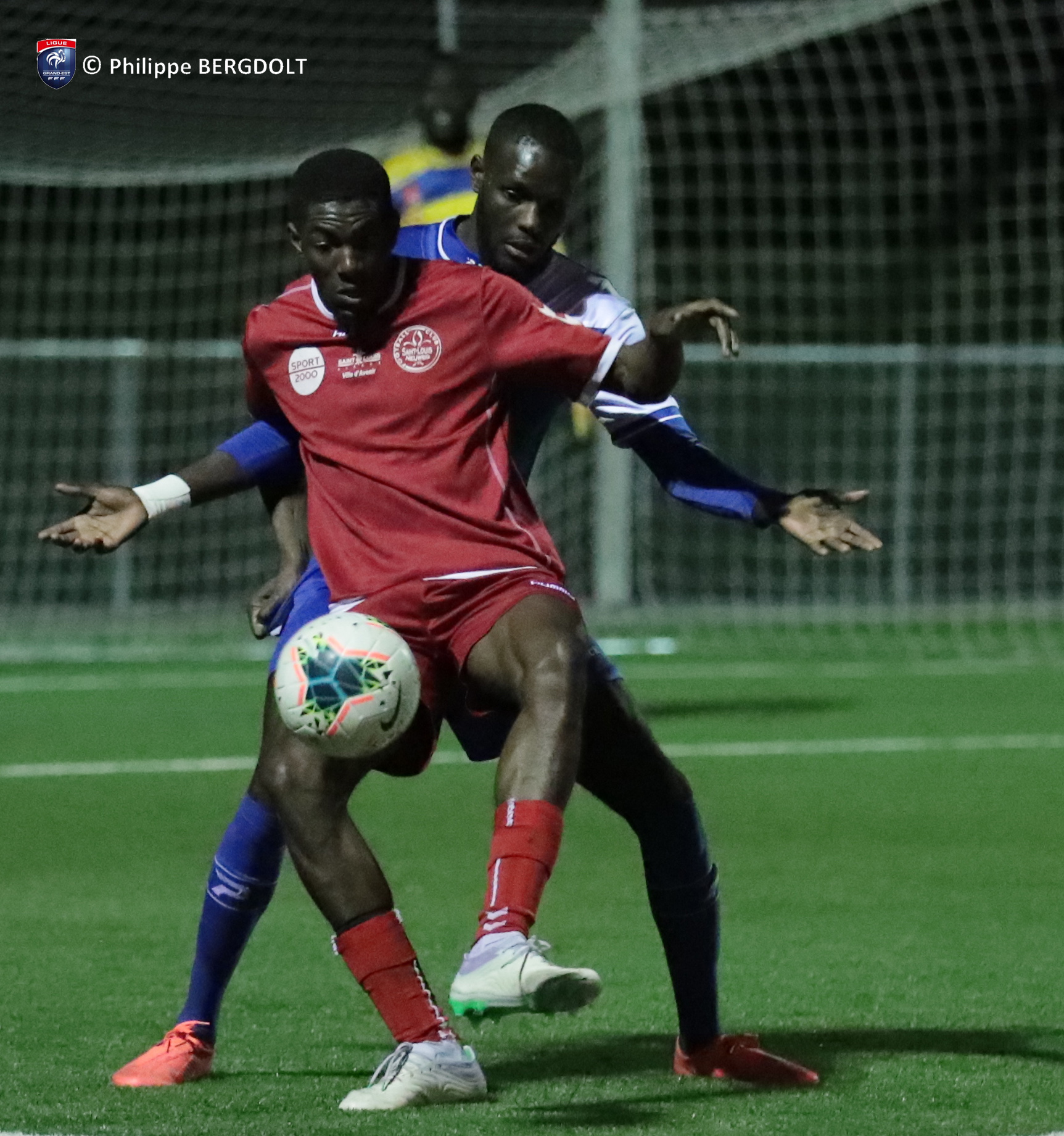 Petite mais belle victoire de nos « Reds », en blanc, sur le terrain de Sarreguemines (bleu). Tout c’est joué en deuxième période, sur un des nombreux corners, Judes Varsovie s’élève plus haut que tout le monde et d’un coup de tête bat le portier sarregueminois. Photos Philippe Bergdolt FCSLN